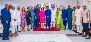 Governor of Lagos State, Mr. Babajide Sanwo-Olu, flanked by President/CEO, Corporate Council on Africa, Ms. Florie Liser (left); Deputy Governor, Dr. Obafemi Hamzat (right), followed by Secretary to the State Government, Barr. Abimbola Salu-Hundeyina and others during a courtesy visit to the governor by the Corporate Council on Africa delegation, at the Lagos House, Marina, on Saturday, 24 February 2024.