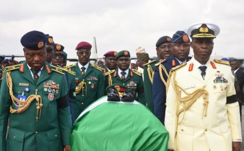 The body of the late Chief of Army Staff Lt. Gen. Taoreed Lagbaja has arrived at the Nigerian Air Force wing of the Murtala Muhammed International Airport in Lagos.